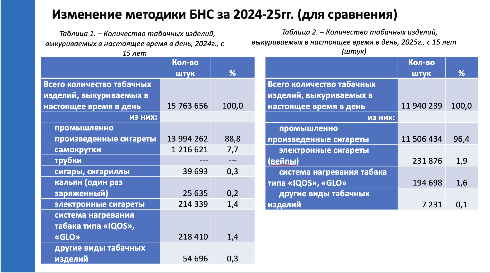 Также изменился инструментарий опроса БНС. Об этом говорят данные по количеству выкуривания табачных изделий среди граждан в возрасте от 15 лет. Если в 2024 году казахстанцы выкуривали в день 15,7 млн разных табачных изделий, то в 2025 году количество табачных изделий в день составляет 11,9 млн штук. Однако как видно из таблицы, подготовленной экспертами ОФ "Стратегия", в 2025 году изменился список продуктов по сравнению с 2024 годом, некоторые просто исчезли.