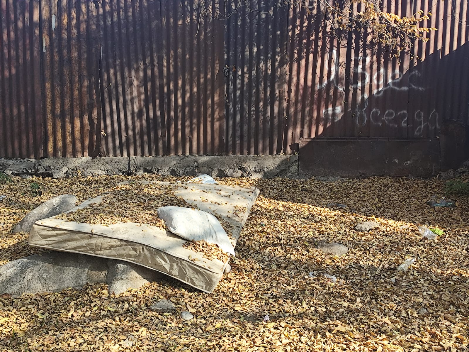 Сразу же выше улицы Джандосова журналисты наткнулись на странную конструкцию из досок и торчащей в разные стороны арматуры. Именно на неё жаловались обратившиеся в редакцию местные жители. На некоторые прутья арматуры надеты стеклянные и пластиковые бутылки, ограждения вокруг конструкции нет.