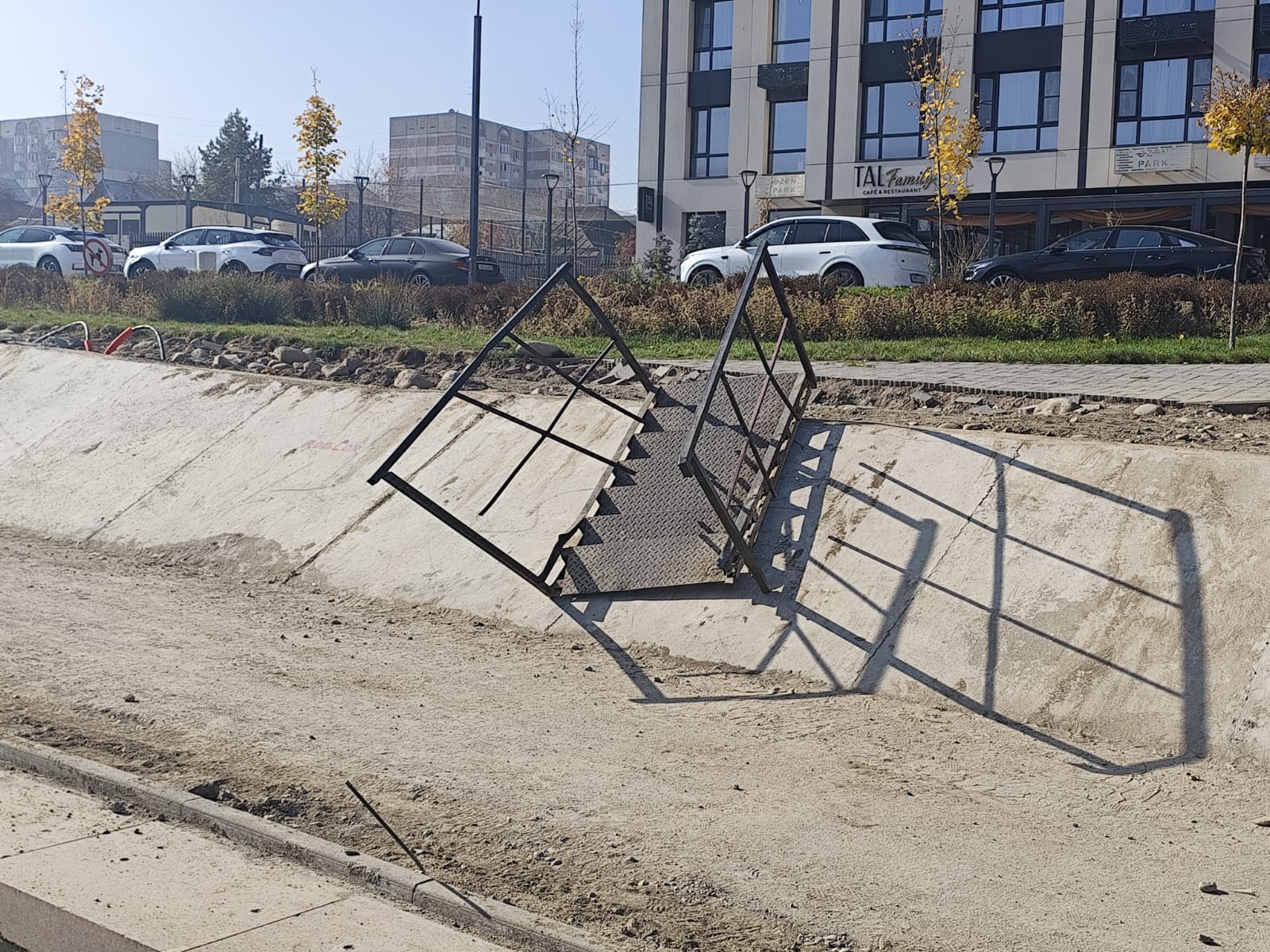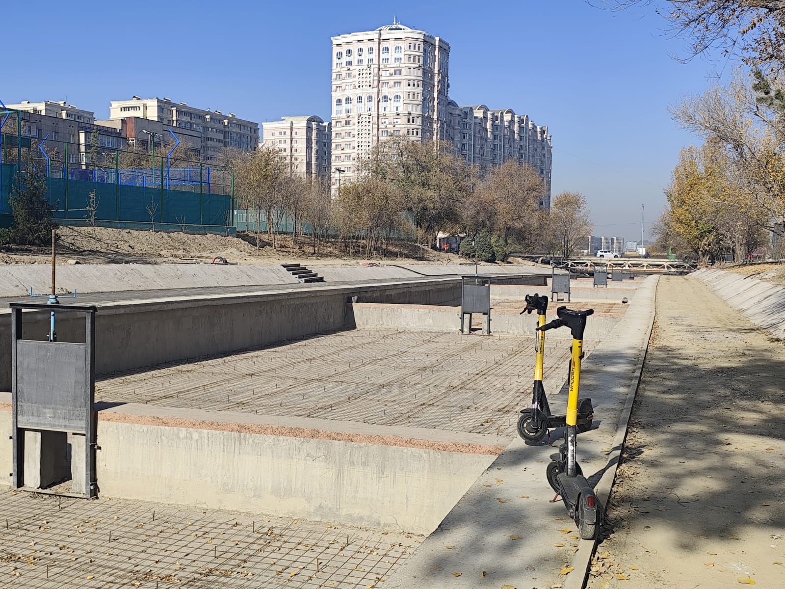 По дороге до улицы Сатпаева рабочие не встретились, хотя часы показывали 10.05. Определенные изменения в отделке русла нельзя не заметить. Новые шлюзы установлены, плиты тоже. Однако на некоторых плитах уже появились внушительные сколы.