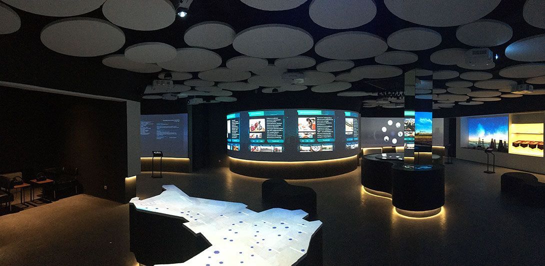 Проекции высокого разрешения позволяют поверхностям оживать через прикосновения и жесты. Музей наполнен кинетическими инсталляциями в виде макетов буровых и добывающих установок. Ими можно управлять с помощью сенсорных панелей.