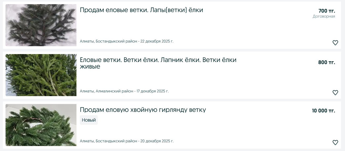 Самым доступным вариантом остаются предложения от частников – покупка еловой лапы. Цена одной ветки начинается от 500 тенге и может расти в зависимости от её ширины и пушистости. Несколько таких лап, собранных вместе, дают хвойный аромат и похожи на небольшую ёлку. Полноценные небольшие деревца можно найти по цене от 5000 тенге, в то время как на маркетплейсах ухоженное дерево в горшке стоит от 25 тыс. тенге и выше, вплоть до неограниченных сумм за премиальные сорта.