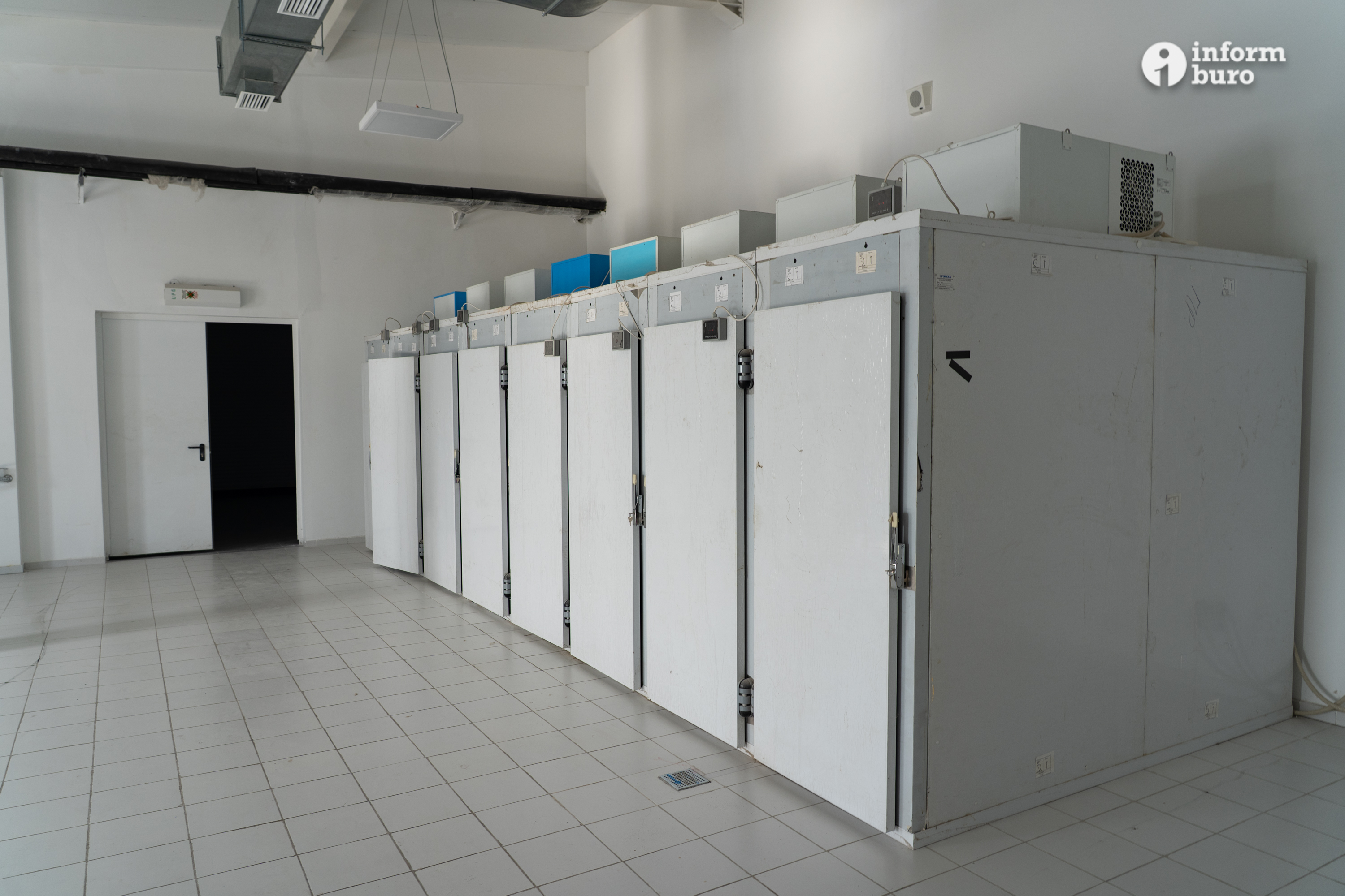 В соседнем помещении находятся холодильники для хранения тел умерших, в каждом из них по четыре полки.