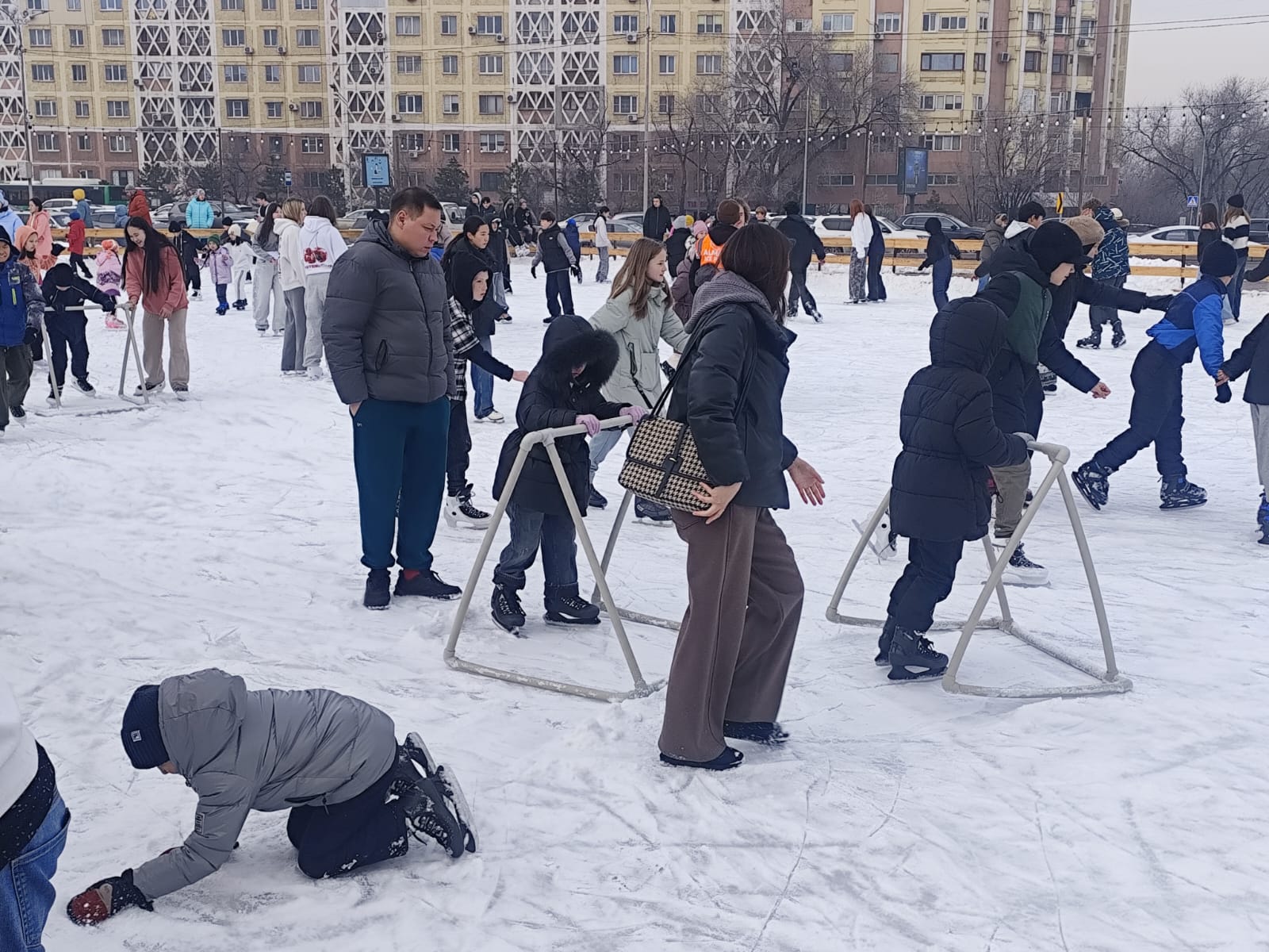 Пока подростки выезжают на лёд с оптимизмом, даже если раньше никогда не надевали коньки, дети дошкольного возраста с опаской посматривают на ледовую площадку. Слишком там оживлённо. Но не все дошколята ведут себя одинаково. Пятилетний Бейбарыс прибыл на лёд в сопровождении трёх сестер и полон решимости взять первый урок.