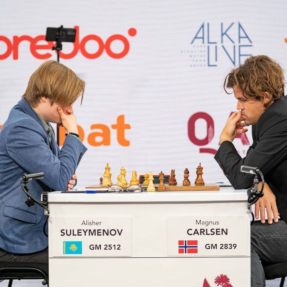 Как это случилось в октябре в столице Катара Дохе, где проходил Qatar Masters Open 2023 с участием полутора сотен шахматистов. Возглавляли стартовый список Магнус Карлсен (2839), Хикару Накамура (2780), голландец Аниш Гири (2760) и ещё пятеро супергроссов. Наши СМИ и блогеры много тогда писали о победе в 31 ход нашего Алишера Сулейменова (2512) над Карлсеном во втором туре.