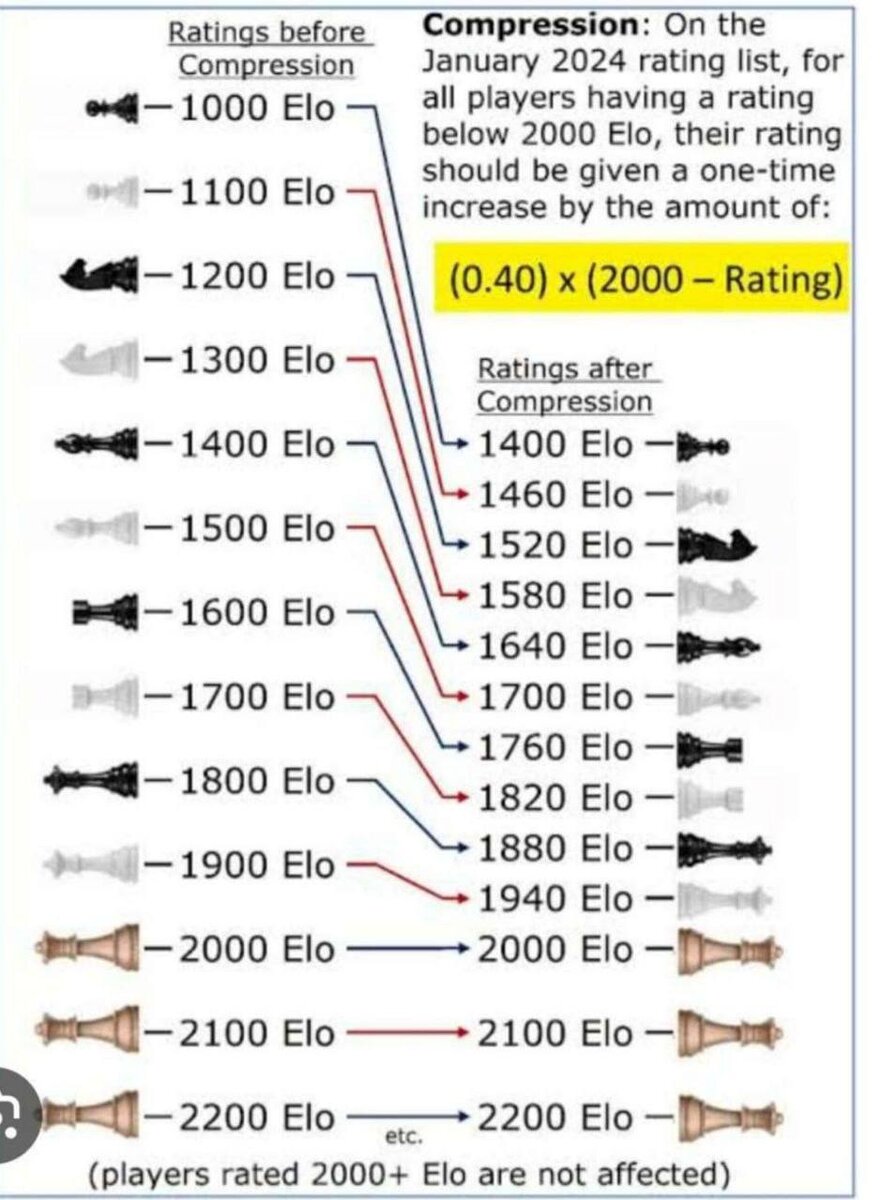 3. С 1 января 2024 года для игроков со стандартным рейтингом ниже 2000 будет применено разовое повышение по формуле 0,4 х (2000 – Рейтинг). Игроки со стандартным рейтингом 2000 и выше сохранят свой текущий рейтинг.