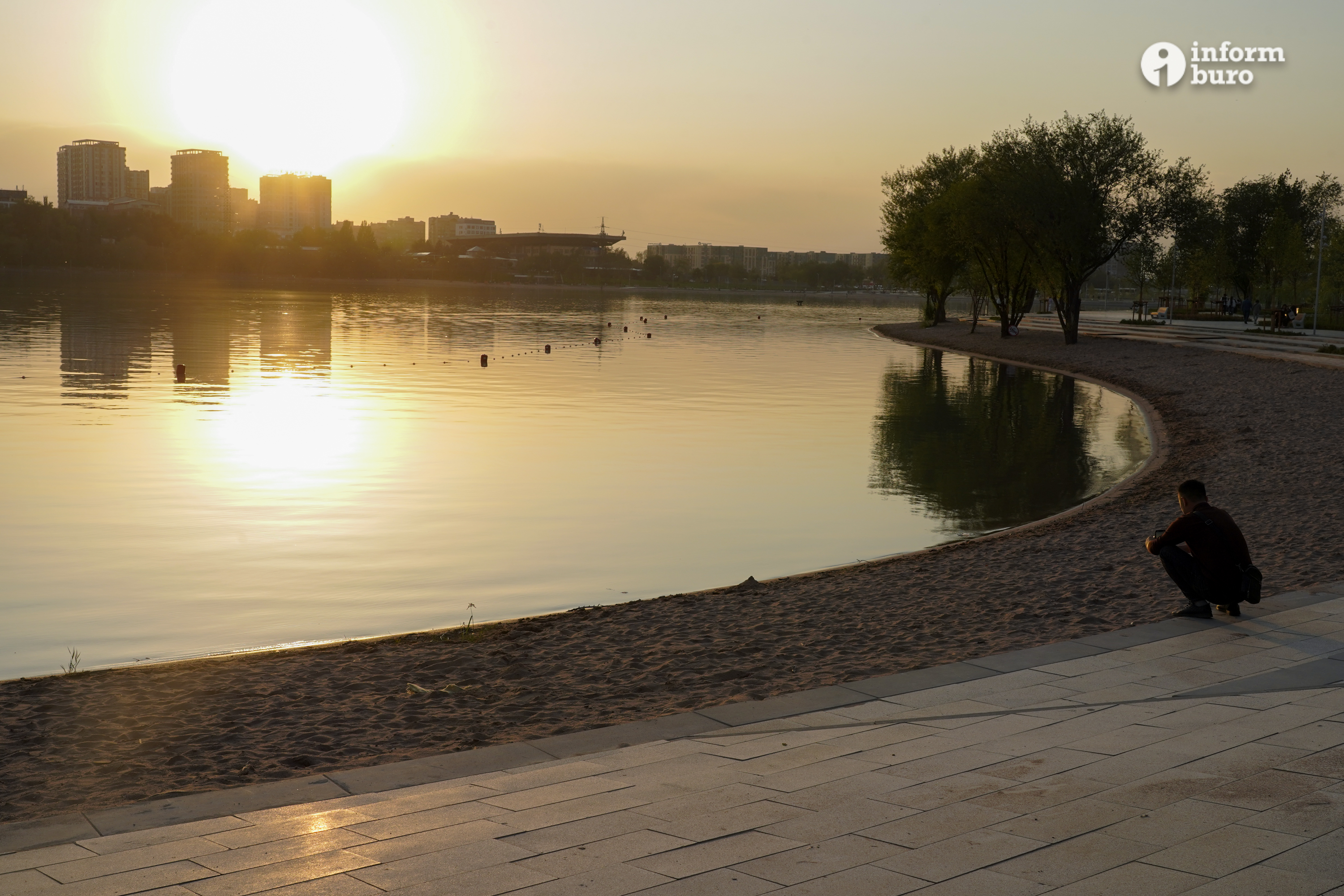 Ограждения возле воды на озере недавно убрали. Горожане сидят на песке вместе с детьми, любуются закатом, запускают игрушечные катера. Попыток совершить водные процедуры никто не предпринимает, так как погода к купанию не располагает.