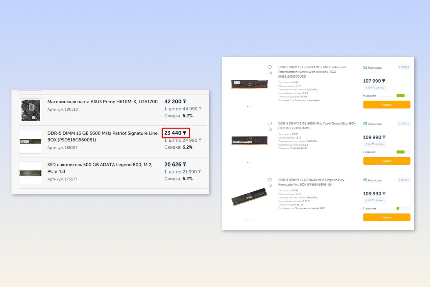 Сравнение цен на оперативную память в Казахстане по скриншотам, сделанным летом и в конце года, показывает резкий и нетипичный для потребительского рынка скачок. Если летом 2025-го модули DDR5 объёмом 16 ГБ с частотой 5200–5600 МГц стоили в среднем около 23–25 тысяч тенге, то сейчас аналогичные позиции предлагаются уже за 105–110 тысяч тенге. Таким образом, за несколько месяцев цена выросла более чем в четыре раза.