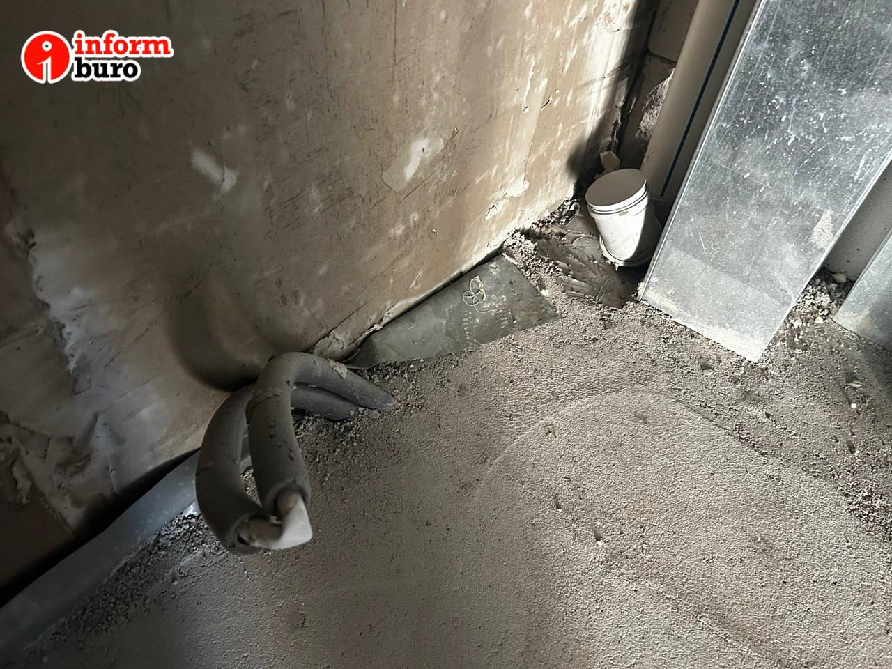 Семён с владельцами заходит в новую черновую квартиру жилого комплекса на правом берегу с живописным видом на реку Есиль и сразу обращает внимание на стяжку. Под ней проглядывают пластиковые трубы отопления.