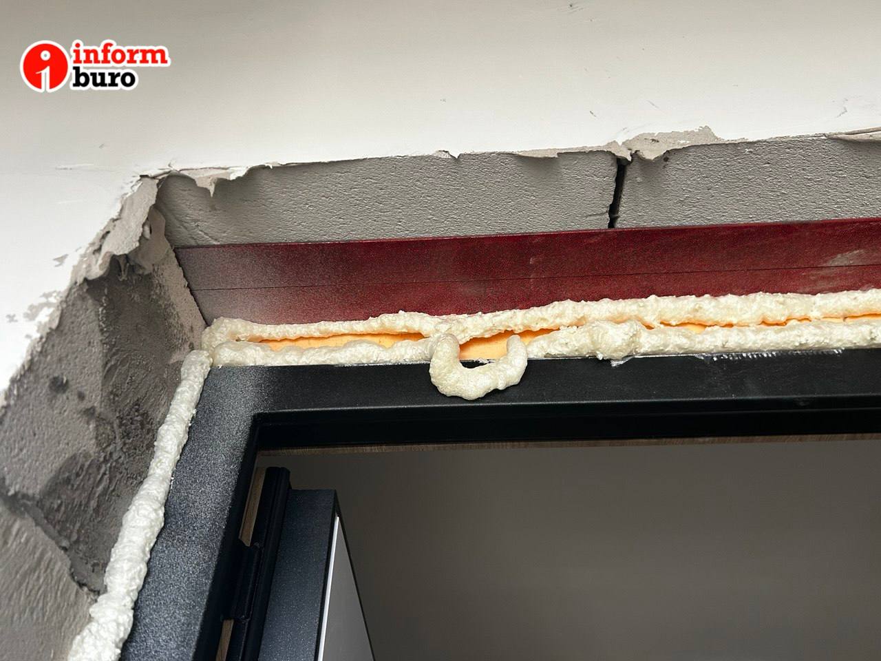 "Нужно обязательно обращать внимание на состояние входной двери. Бывает, что она криво установлена или бывают механические повреждения на самой двери. Здесь, например, по бокам не уложен плиточный сапожок с обеих сторон. Верхняя панель над дверью не закреплена и болтается. Надо нивелиром ещё раз проверить", – комментирует специалист, осматривая дверь.