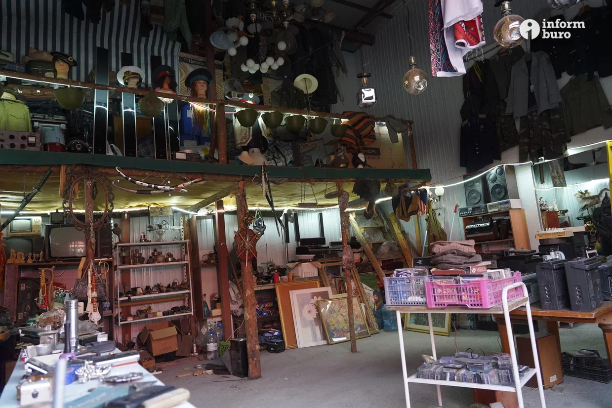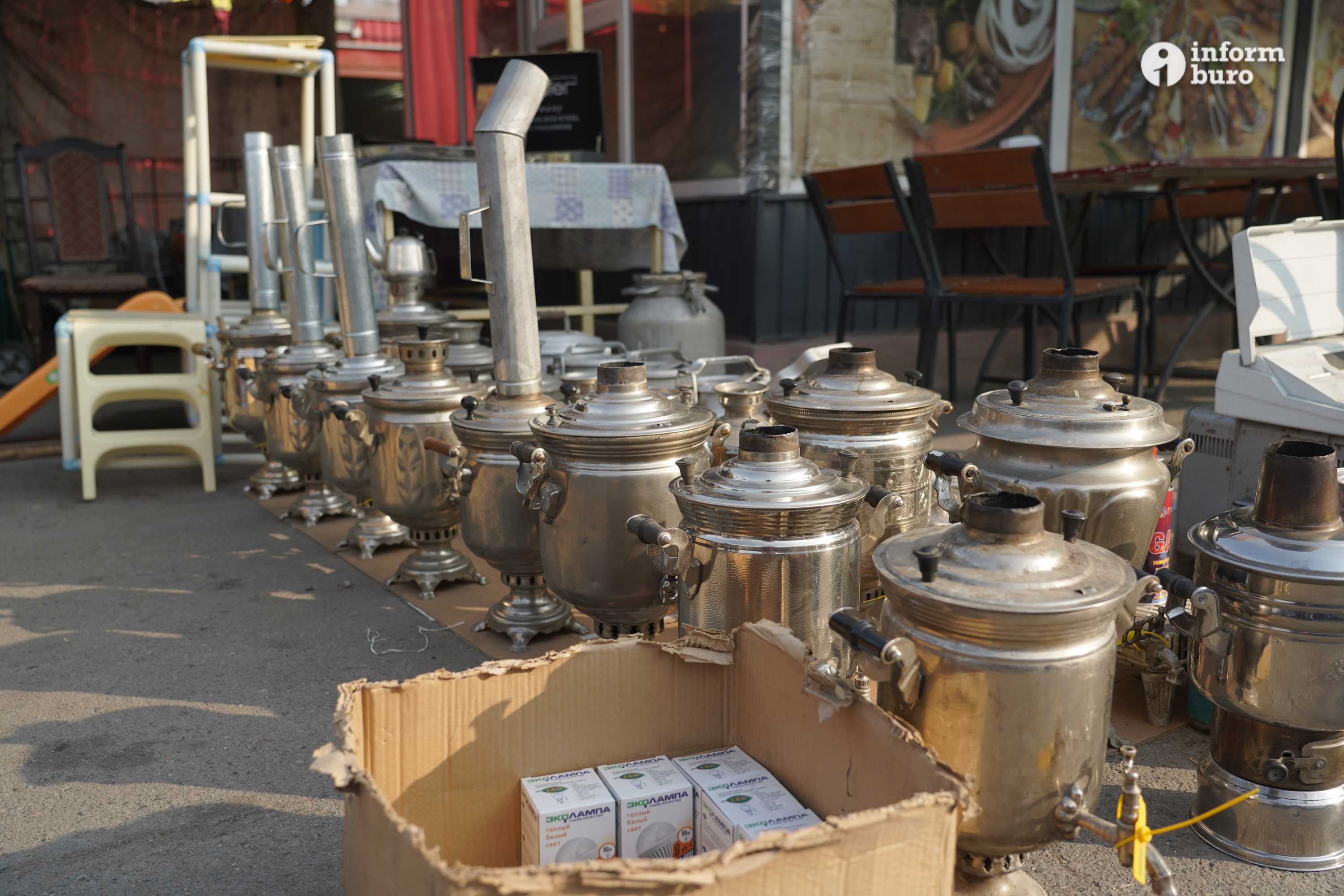 Кассетные магнитофоны "Романтик" и "Электроника", первые плейеры, видеомагнитофоны, военные кители, фарфоровые сервизы, хрустальные люстры, чучела зверей и птиц, торшеры и мебель, советские рубли и бумажные купюры достоинством в 10 и 20 тенге. На блошином рынке рядом соседствуют ценные предметы, выставочные экспонаты и ситцевые платья из бабушкиных сундуков.