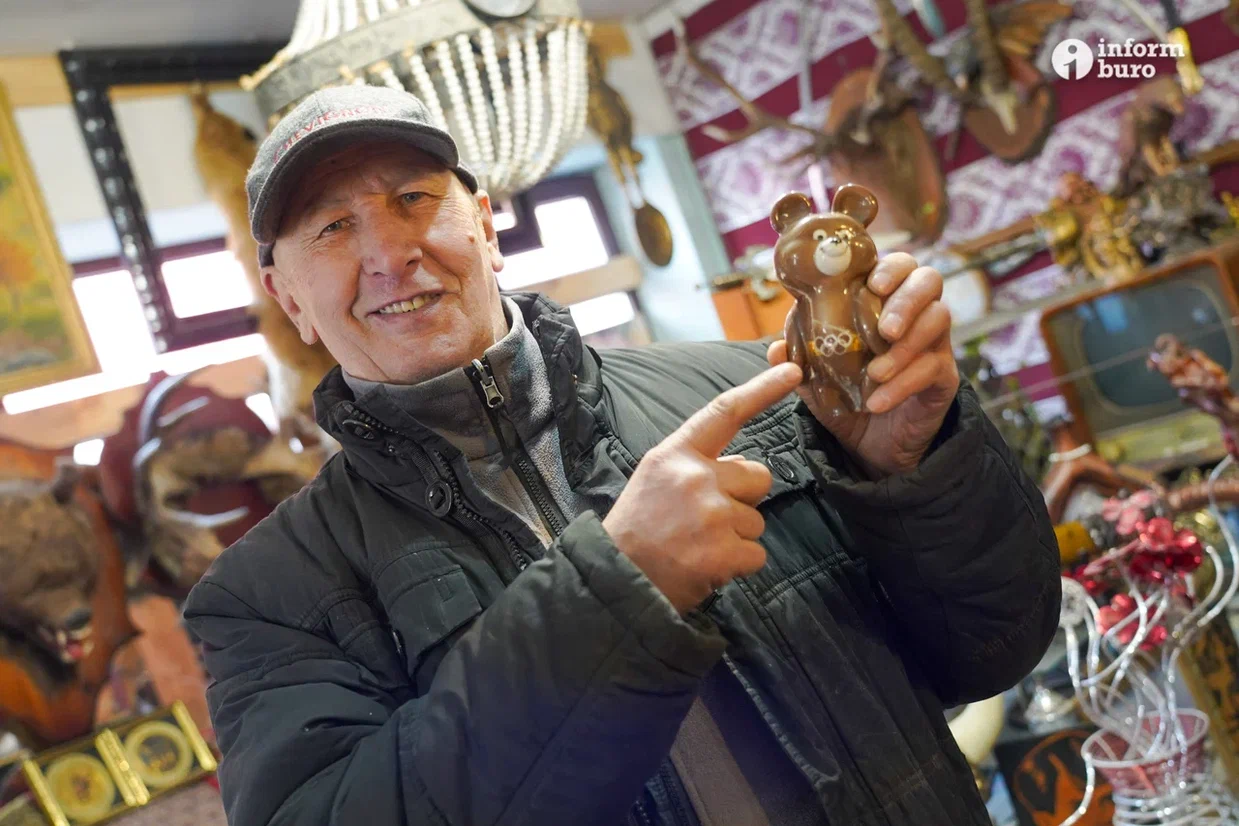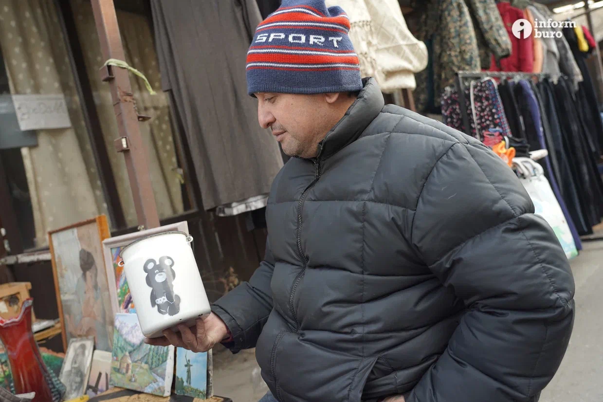 "Олимпийского мишку изображали порой на самых неожиданных предметах. Например, на бидоне для молока. Вот такой бидончик у нас сегодня на продажу. Отдадим за две тысячи тенге", – называет сразу цену продавец Эрик в вязаной шапочке советских времен.