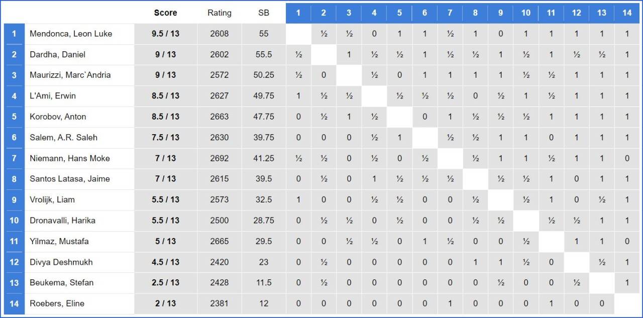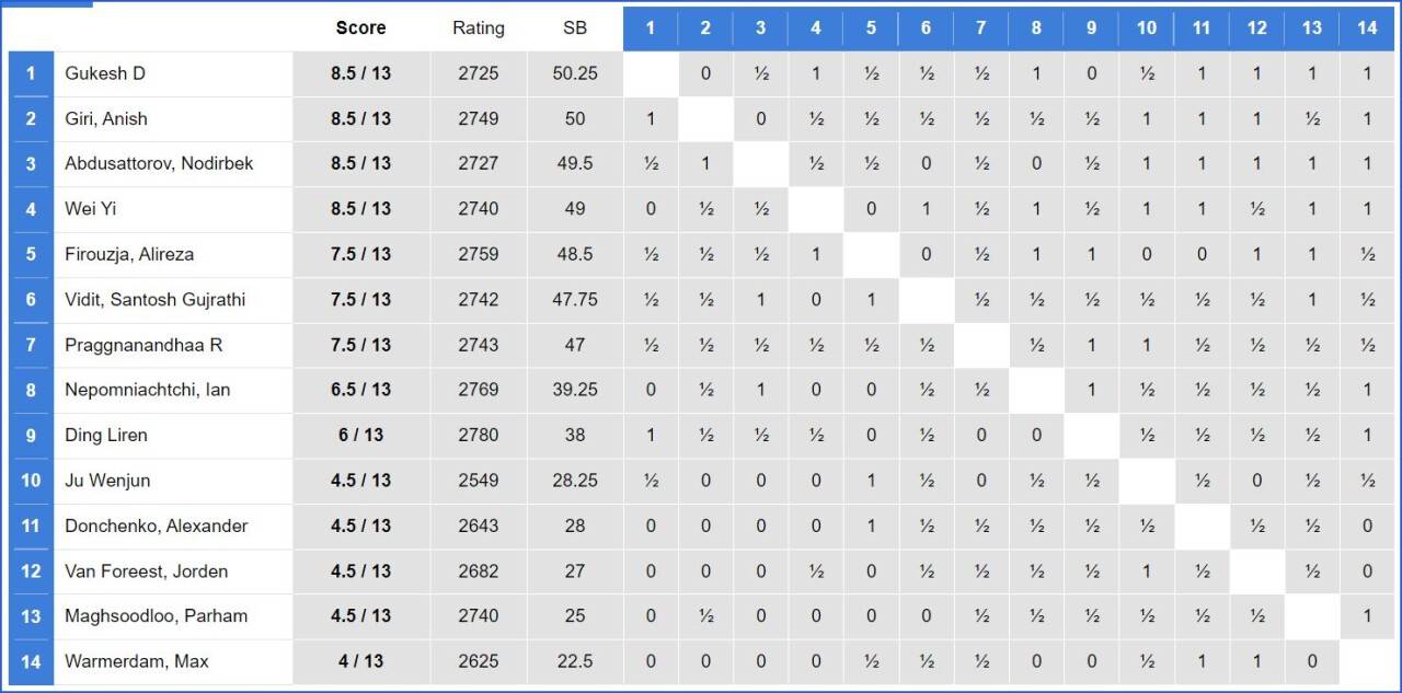 Словно в шоссейной велогонке, лидеры менялись чуть ли не после каждого тура. А перед последним, 13-м, туром на призовые места претендовала ровно половина участников! По 7½ очков имели узбек Нодирбек Абдусатторов (рейтинг Эло – 2727 пунктов), хозяин турнира Аниш Гири (2749), Гукеш (2725), Видит (2742) и китаец Вэй И (2740), на пол-очка меньше было в активе у Прагнанандхи (2743) и Фирузджи (2759).