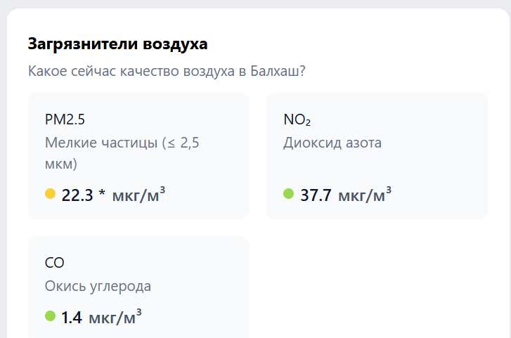 По данным сайта, концентрация PM2.5 в Балхаше была в 4,5 раза выше среднегодового значения нормы PM2.5, рекомендуемого ВОЗ.